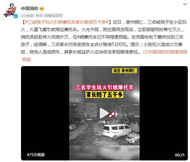 近日,贵州铜仁,三名熊孩子在小区玩火,火星飞窜引燃周边摩托车。火光乍现,附近居民发现后,立即报警同时帮忙灭火,消防员赶赴将火彻底扑灭,但4辆摩托车已不同程度损毁。在民警协助下最终找到三名孩子,经调解,三名家长对各受损车主合计赔偿5100元。提示:小孩玩火造成火灾事故,给他人造成损失,其家长或监护人应当依法承担赔偿责任。