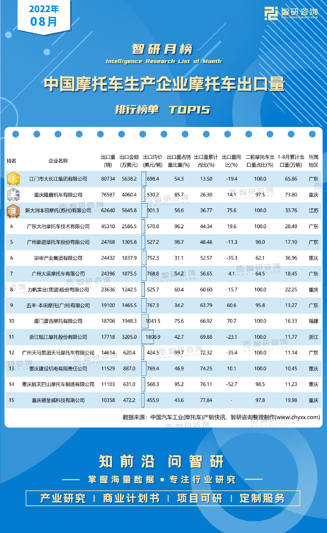 依据榜单可知,出口量排名前15的摩托车生产企业出口量累计占比达到77.84%,江门市大长江集团有限公司以超过8万辆夺冠,其出口均价698.37美元/辆,全部出口的二轮摩托车。
