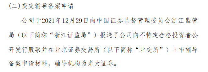 12月29日,华洋赛车与光大证券签署了在北交所上市的辅导协议,并于同日向浙江证监局报送了上市辅导备案申请材料。