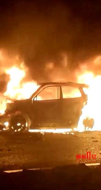 从视频中能够看到,道路上有一辆正在燃烧的面包车,火焰吞噬了车身。有个人影平躺在车子旁边,一动不动。面包车前方约10米的路面上,倒着一辆起火的摩托车。